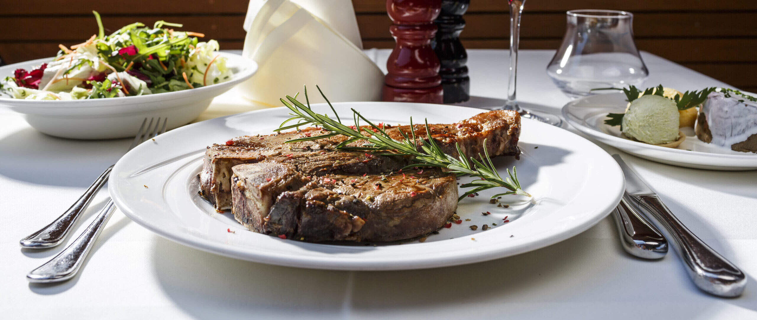 Dort erwarten Sie neben den klassischen Salaten auch immer besondere Kreationen und spannende Überraschungen, sowie feine Antipasti, weitere Beilagen sowie Gebäck. Serviert wird Ihr Steak immer mit einem Ofenkartoffel vom Bauern, Sauerrahmsauce, hausgemachter Kräuterbutter und cremiger Polenta.
